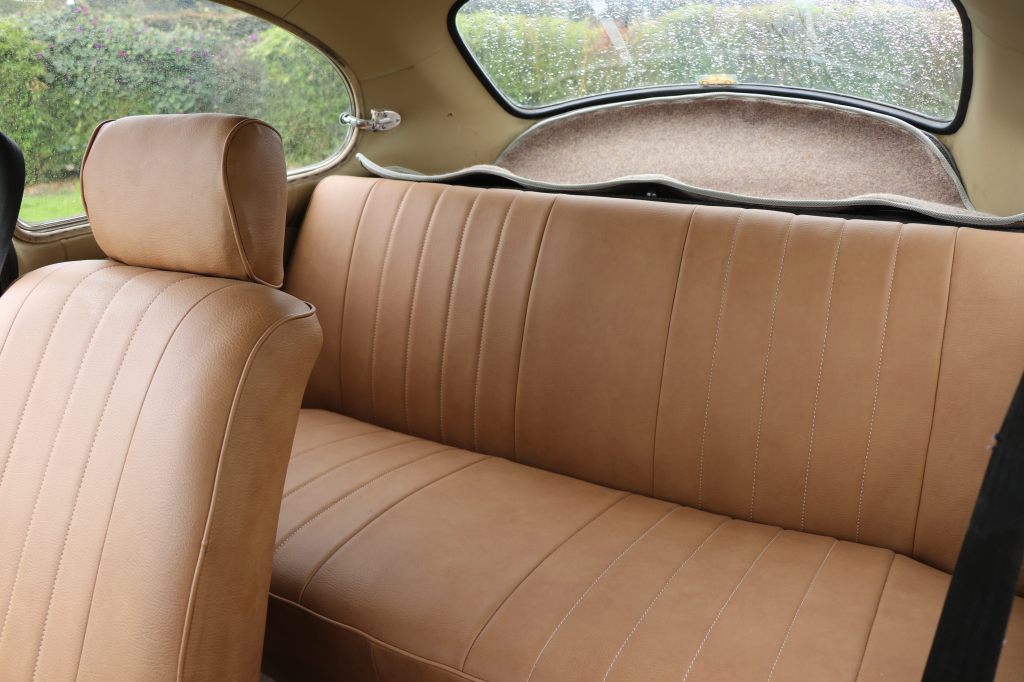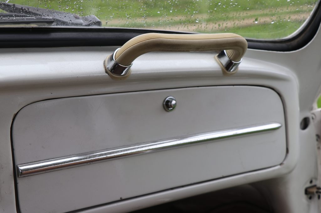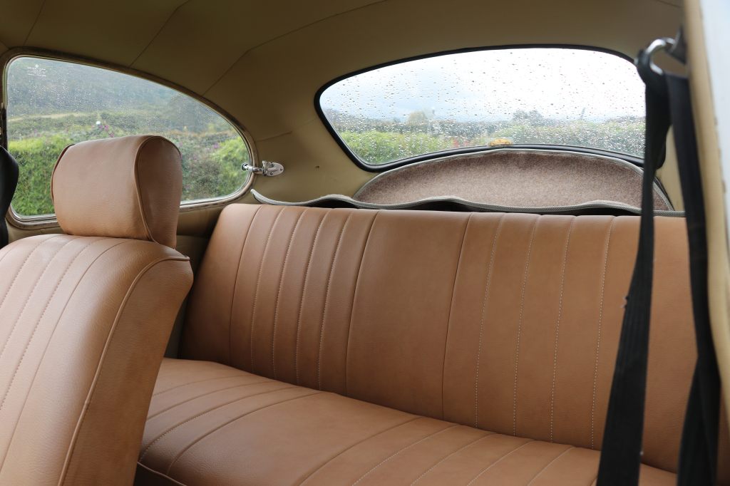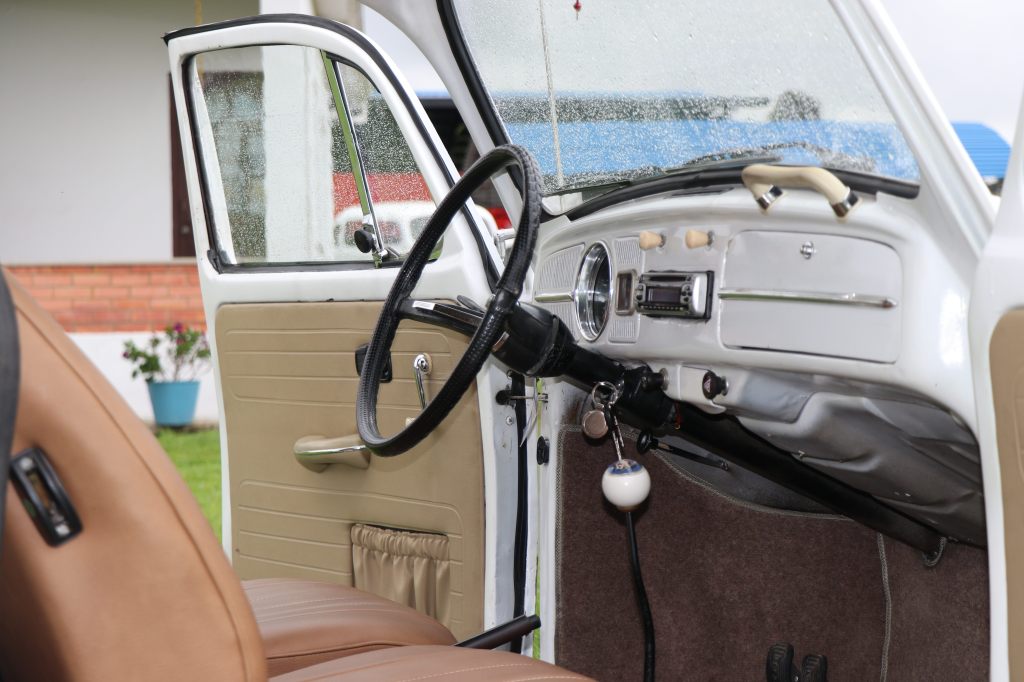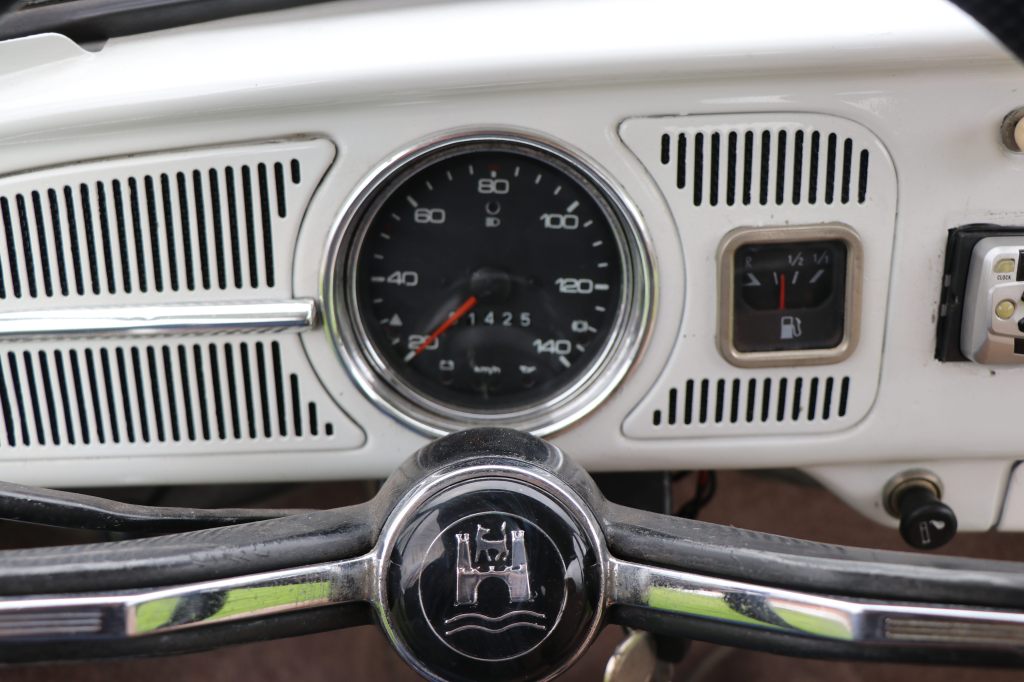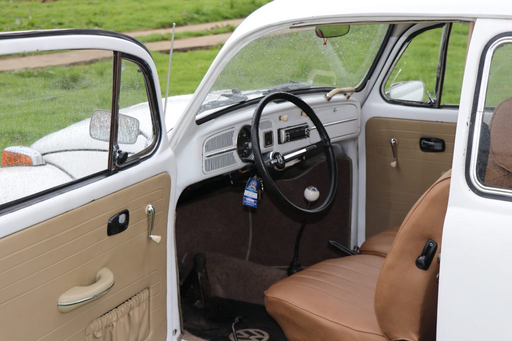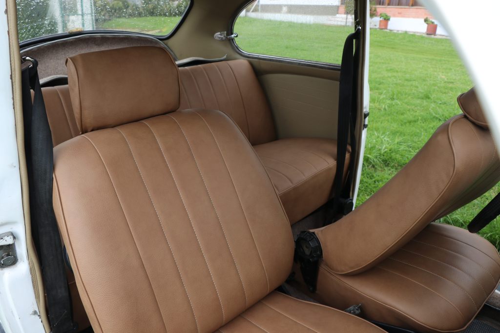 Su diseño inconfundible, con líneas suaves, faros redondeados y defensas cromadas, conserva el espíritu original del Escarabajo, símbolo de una época donde la conducción era pura y sencilla. El interior beige, cuidadosamente restaurado, ofrece un ambiente luminoso y acogedor, con asientos tapizados en vinilo, tablero original y detalles que evocan la autenticidad de su era.