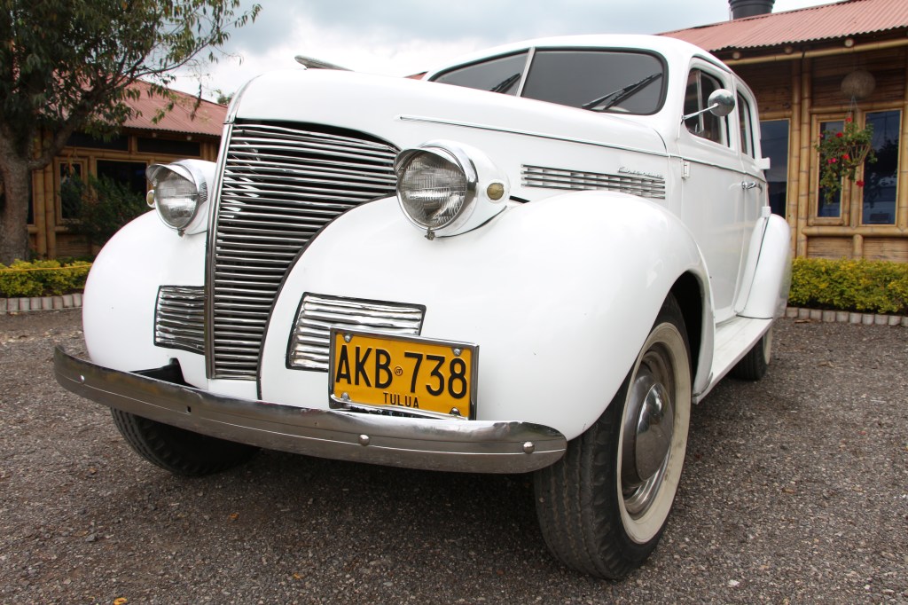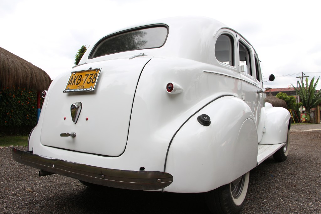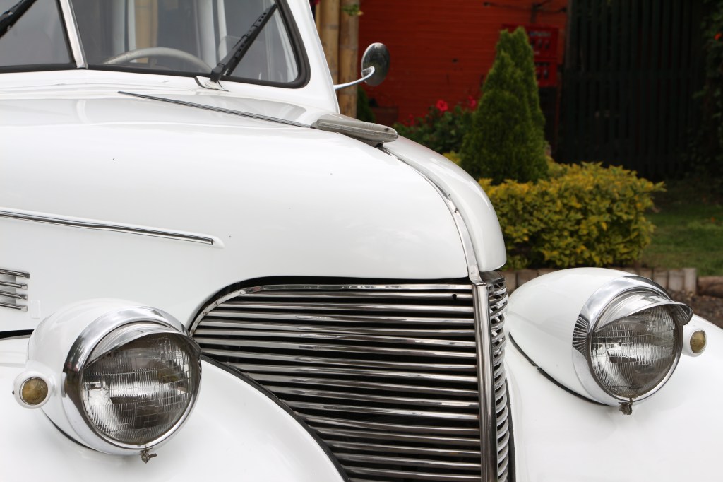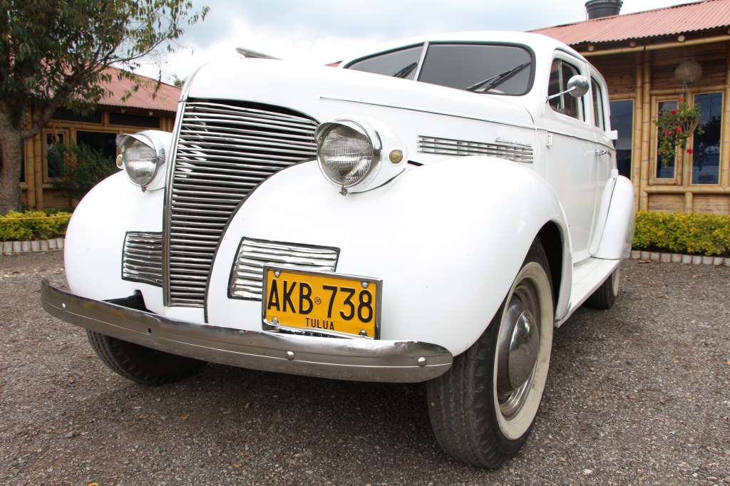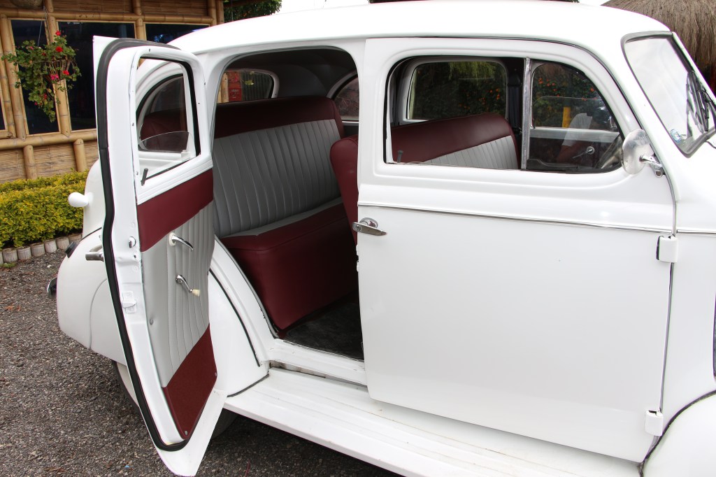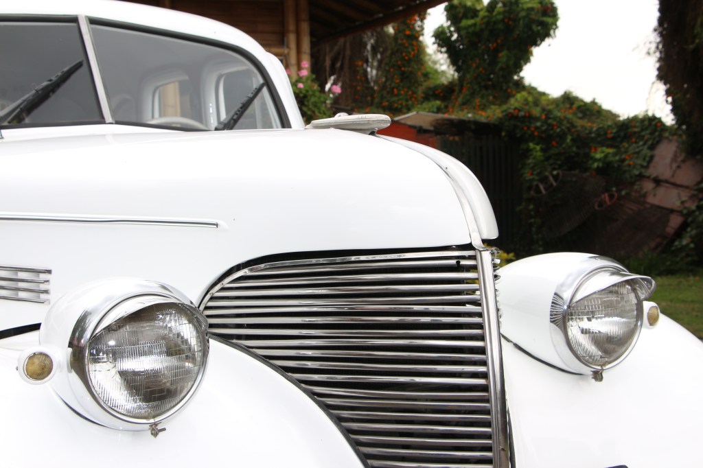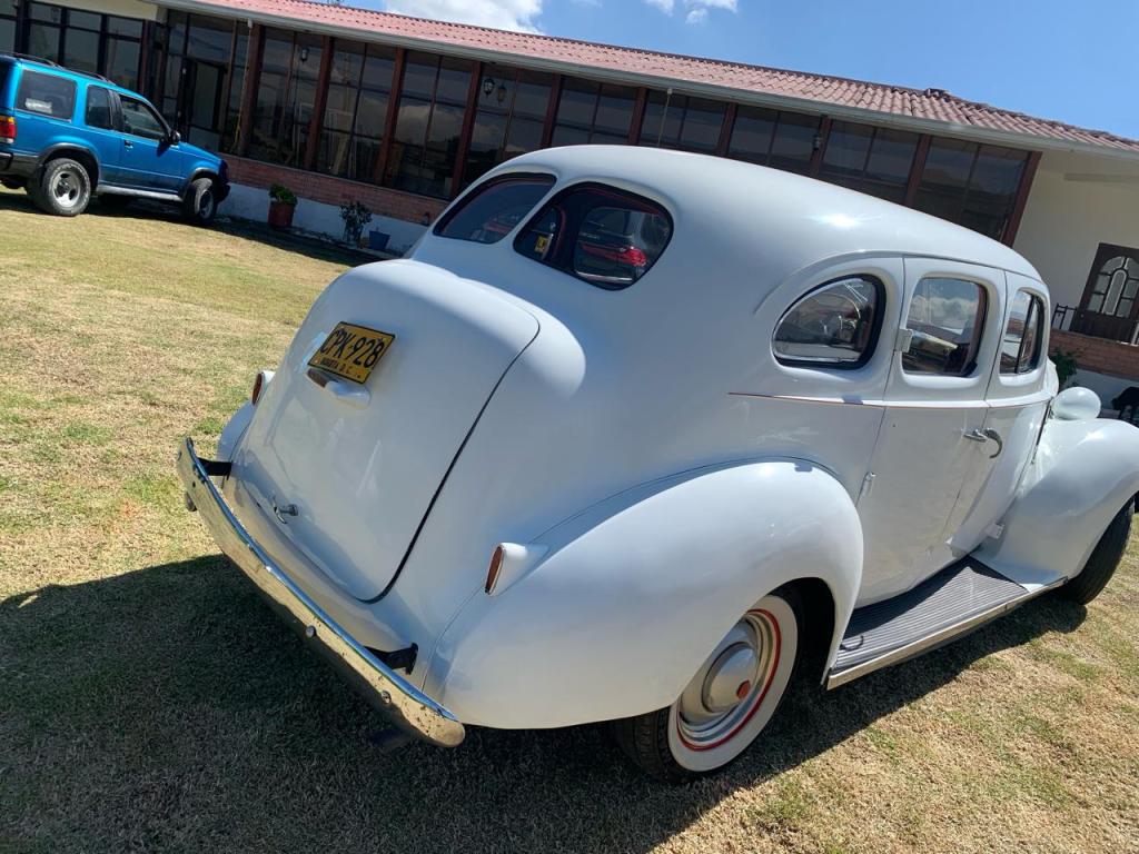 Este sedán de preguerra presenta líneas aerodinámicas con su distintiva parrilla vertical cromada, faros prominentes y guardabarros traseros fluidos. El interior ofrece asientos tipo banco con tapicería de época, un tablero metálico con instrumentación original y elevalunas manuales, todo ello conservando el auténtico carácter de finales de la década de 1930.
