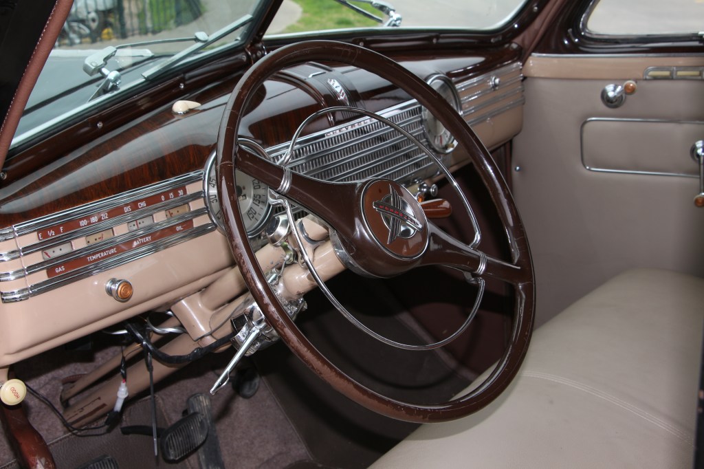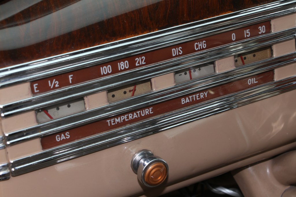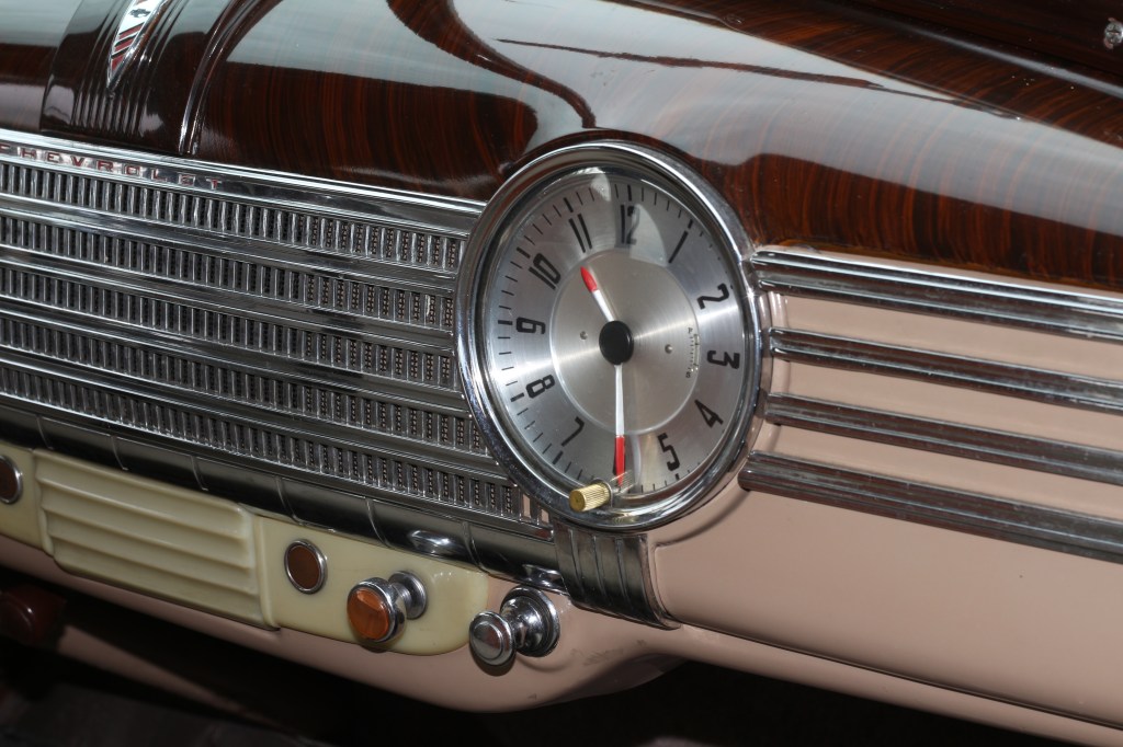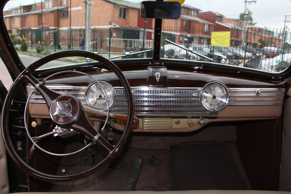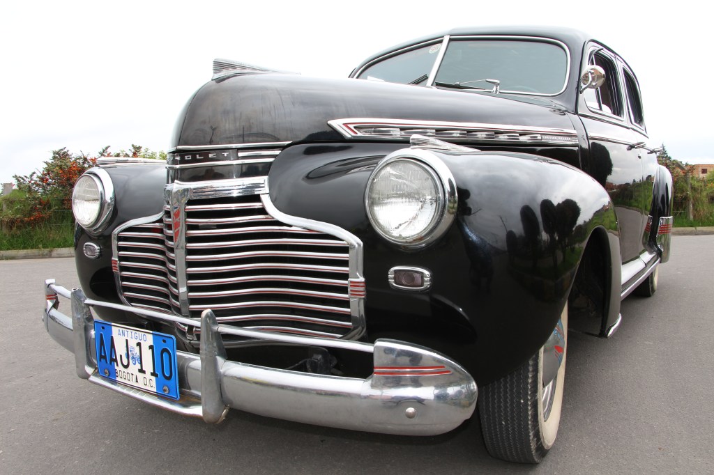 Este modelo de preguerra encarna la transición de Chevrolet hacia un diseño más robusto y aerodinámico, con su icónica parrilla cromada horizontal ancha, faros integrados y molduras laterales cromadas que se extienden a lo largo de la carrocería. El interior destaca un tablero de metal con detalles de imitación madera, indicadores rectangulares típicos de la época y un gran volante adornado con el escudo de Chevrolet.
